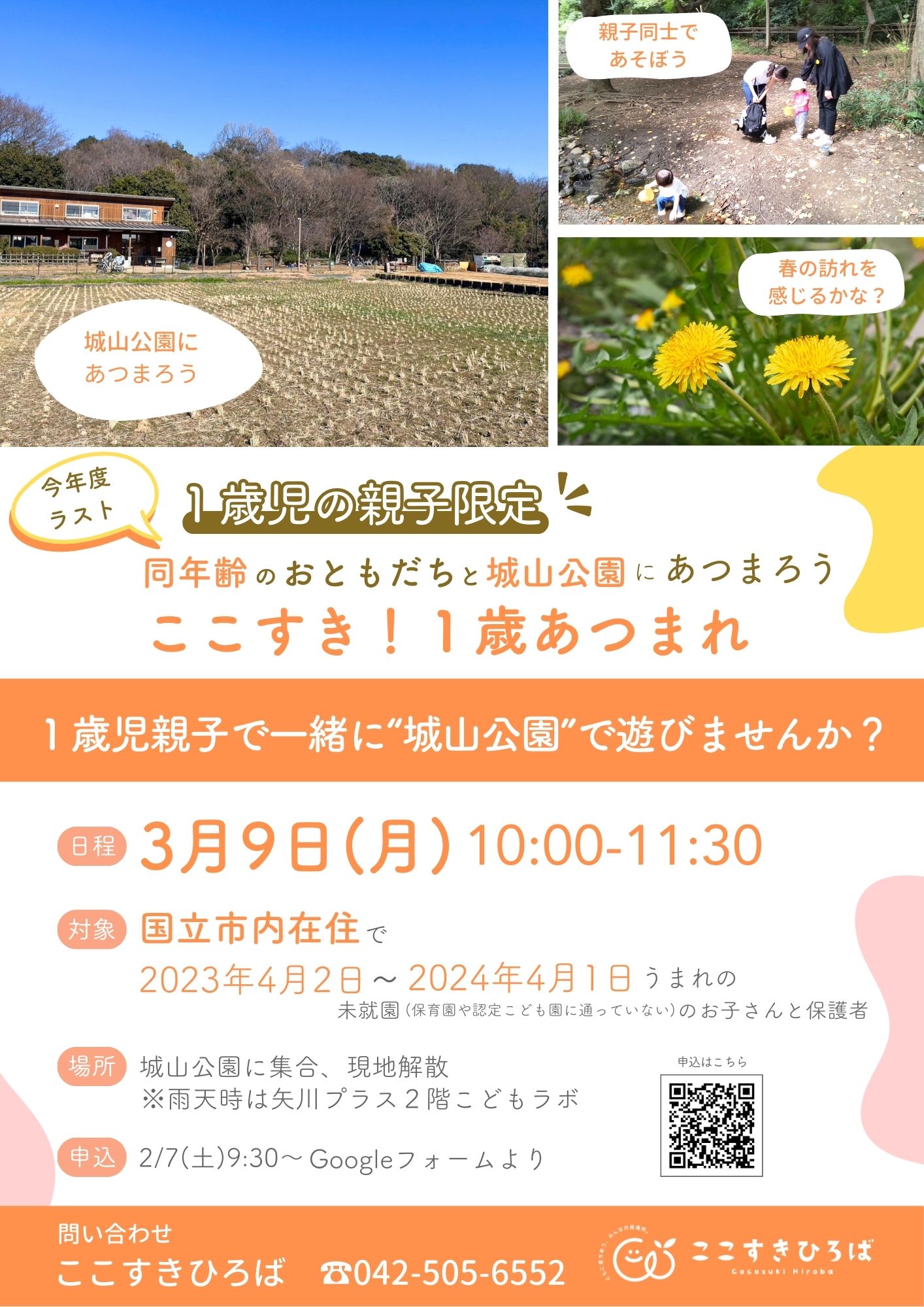 | 対象 | 国立市内在住で2023年4月2日~2024年4月1日うまれの未就園のお子さんと保護者 |