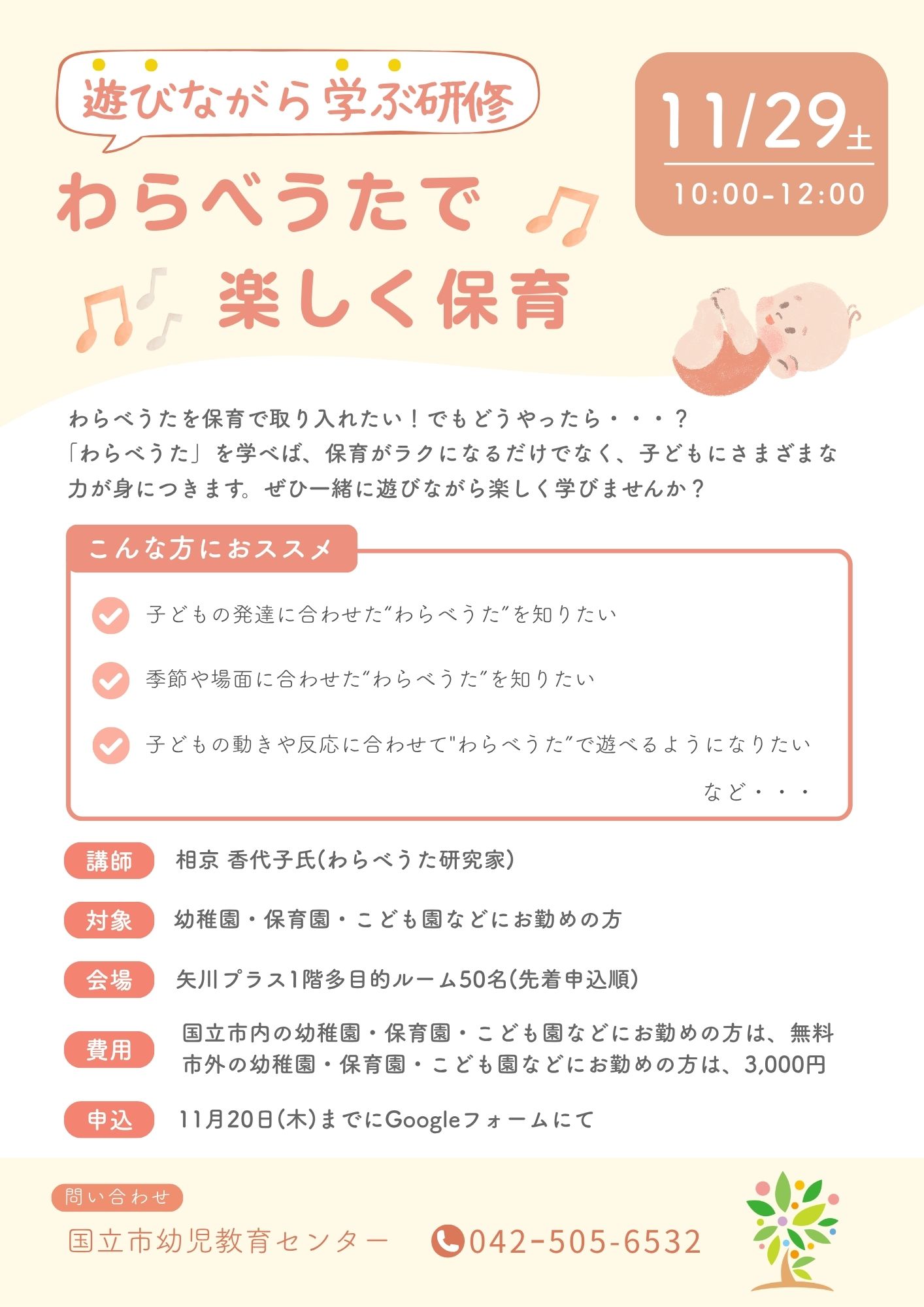 | 費用 | 国立市内の幼稚園・保育園・こども園などにお勤めの方は、無料 国立市外の幼稚園・保育園・こども園などにお勤めの方は、3,000円 |