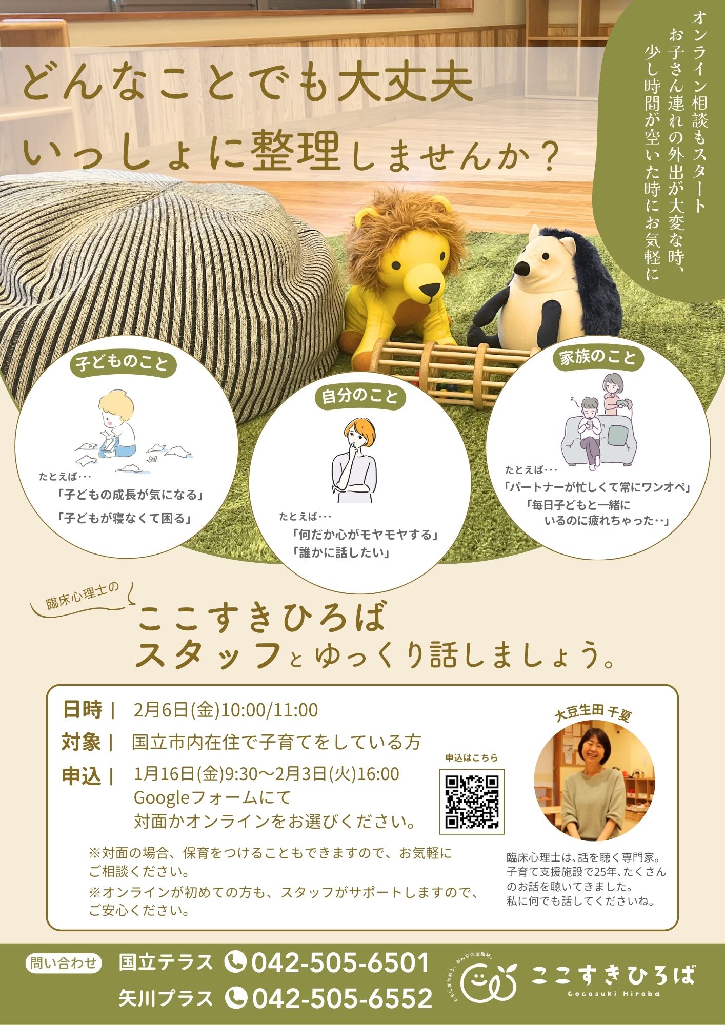 ここすきひろばスタッフの臨床心理士とゆっくり話しましょう。