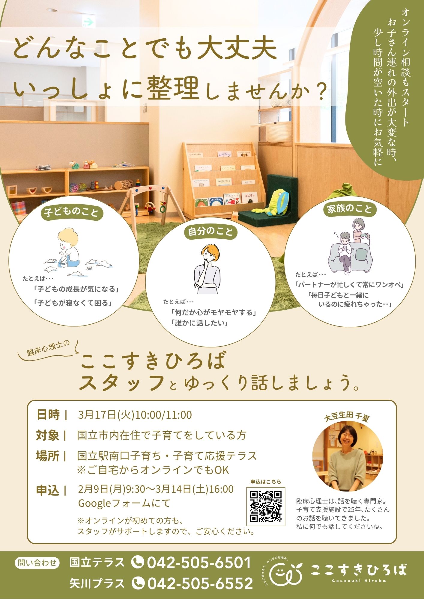 ここすきひろばスタッフの臨床心理士とゆっくり話しましょう。