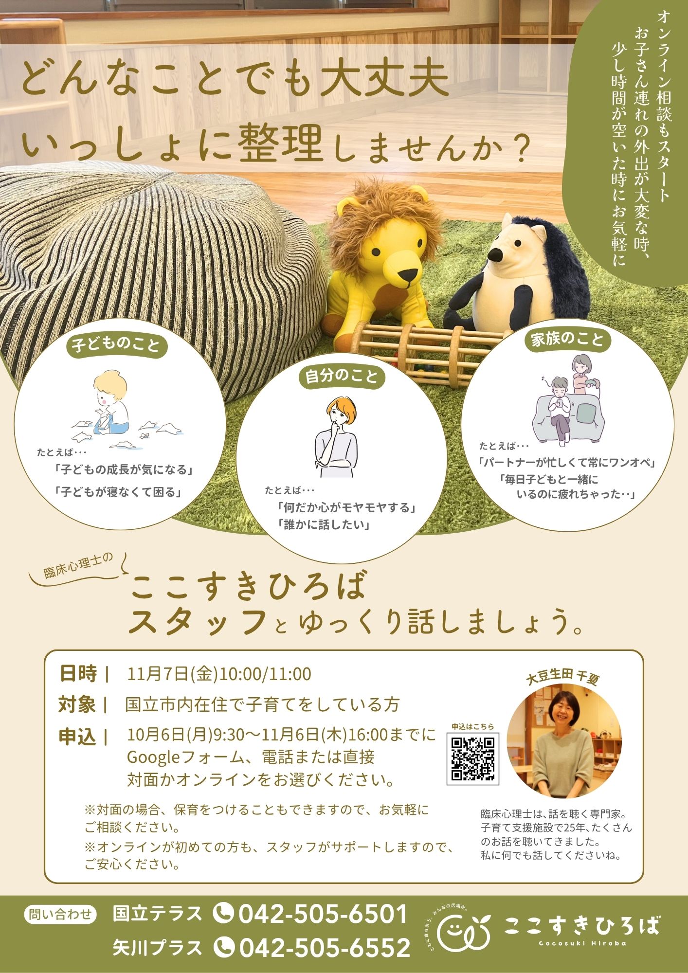 ここすきひろばスタッフの臨床心理士とゆっくり話しましょう。
