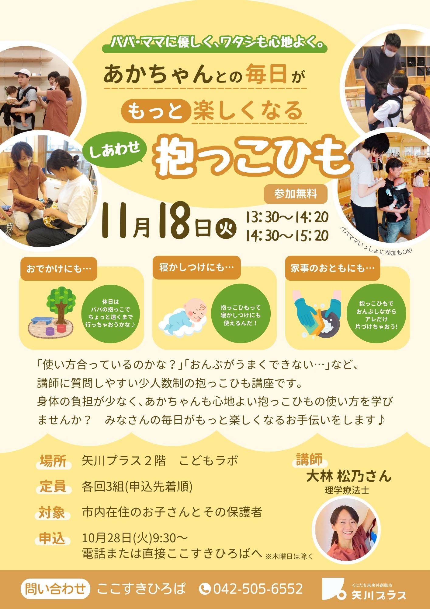 参加希望の方は、11月17日(月)17:00までに電話(042-505-6552)または直接ここすきひろばまでお申し込みください(申込先着順です)。