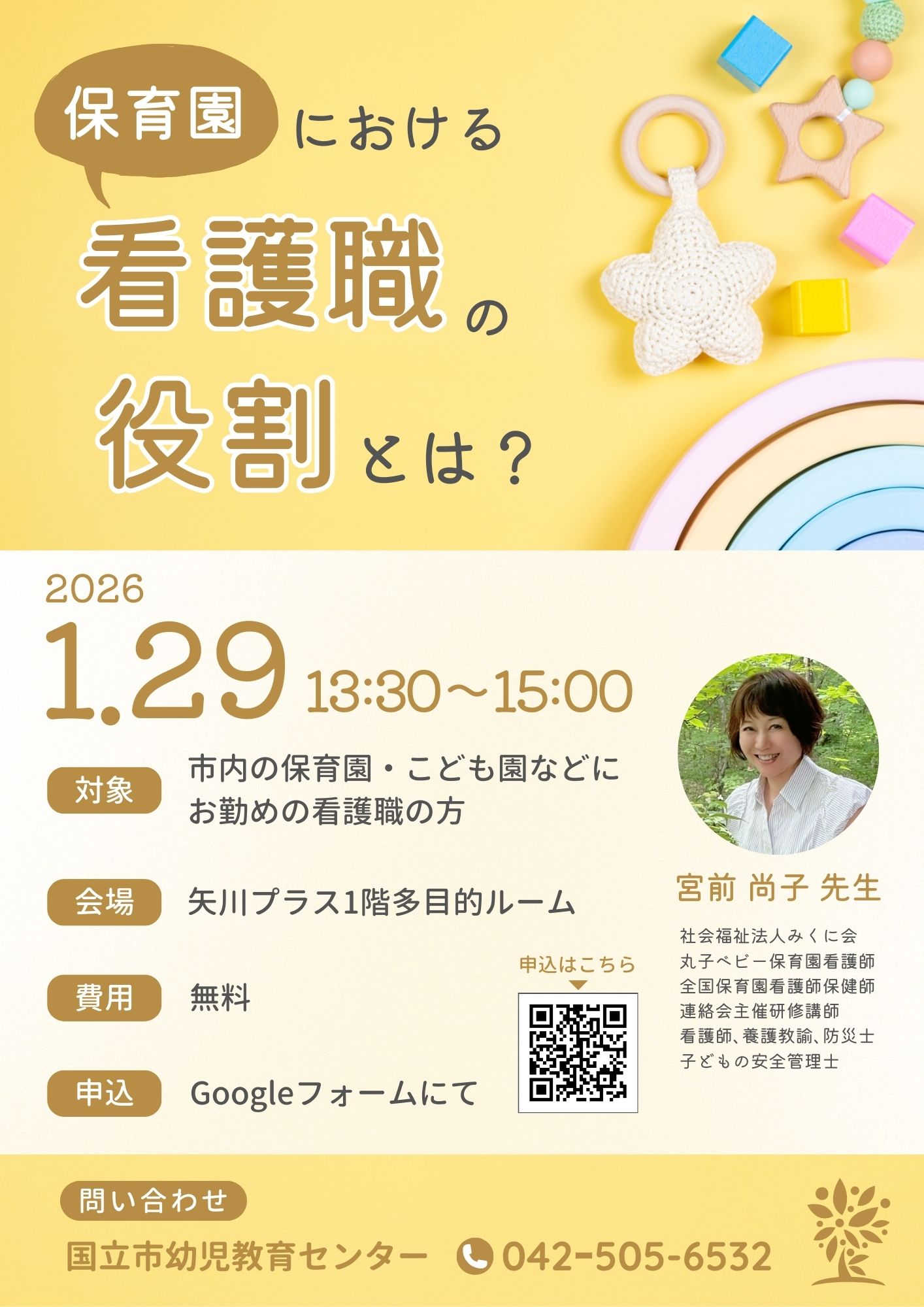 | 対象 | 国立市内の幼稚園・保育園・こども園などにお勤めの看護職の方 |