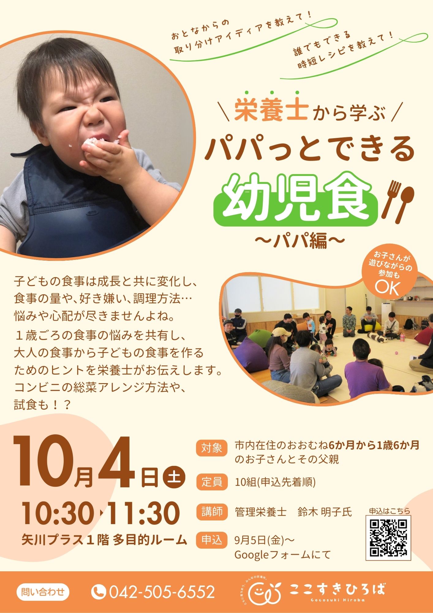 参加希望の方は、9月5日(金)~Googleフォーム、電話(042-505-6552)またはここすきひろばの窓口までお申し込みください。