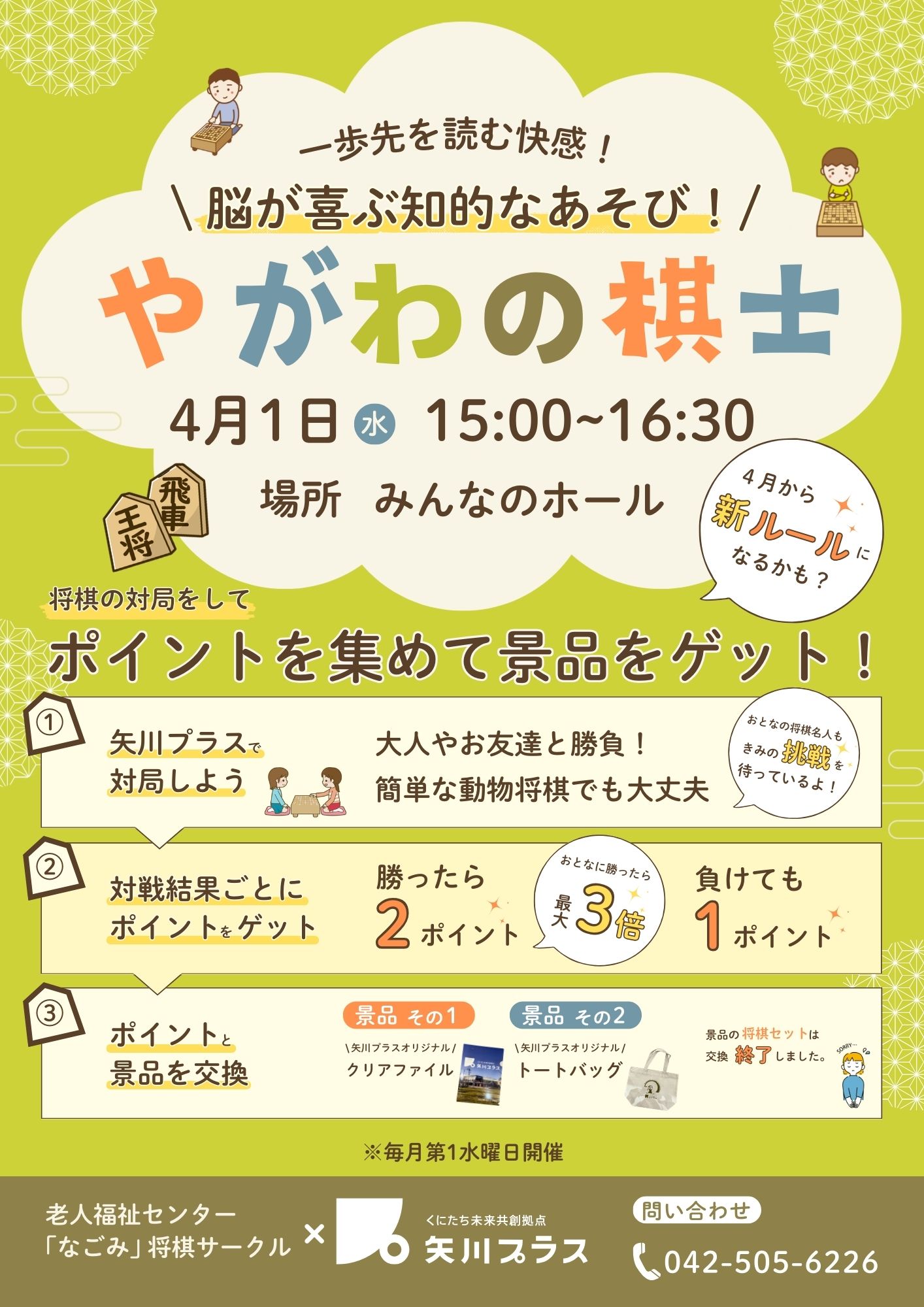 | 主催 | 矢川プラス、老人福祉センター「なごみ」将棋サークル |